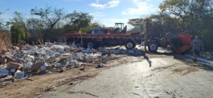 Carreta carregada com livros didáticos tomba no Anel Viário Leste de Montes Claros