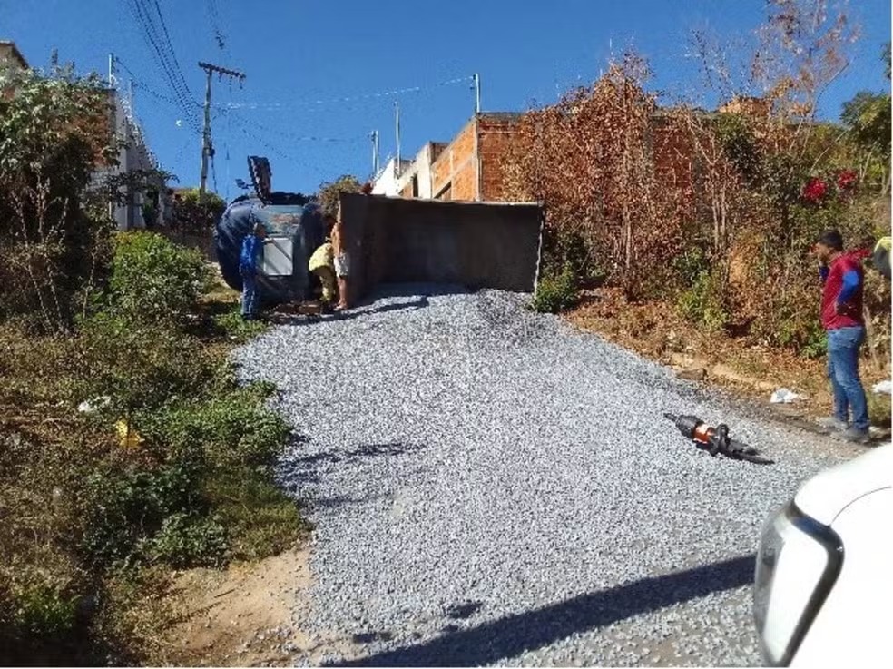 Um caminhão caçamba, que transportava brita, tombou na manhã desta segunda-feira (28) em uma rua do bairro Santa Rafaela. O acidente deixou o motorista, de 49 anos, ferido.