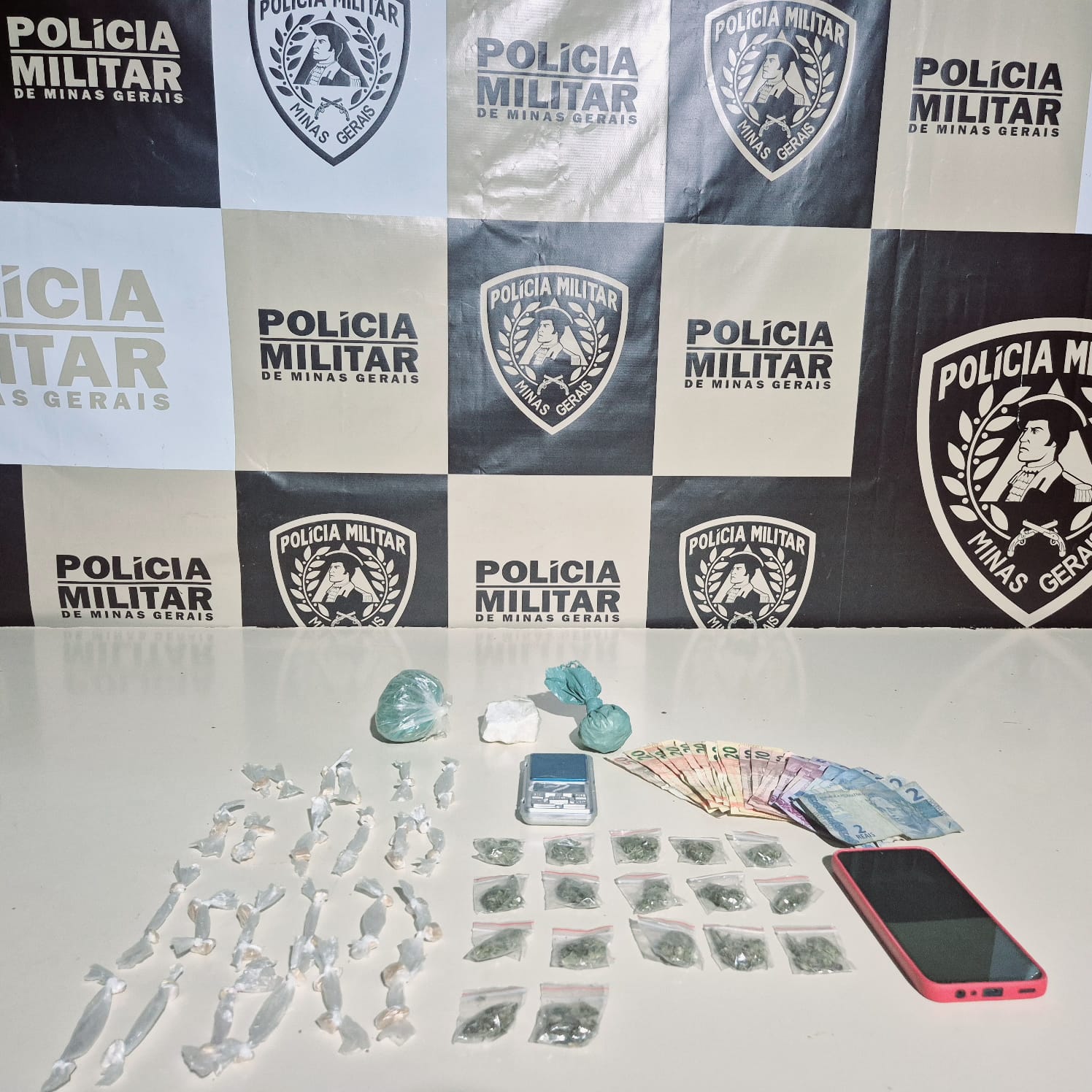 Em buscas no imóvel, os militares localizaram nos fundos da residência, sobre um telhado, uma sacola com: 51 pedras de crack, 17 buchas de maconha, porções de maconha e cocaína, uma balança de precisão, um celular Samsung e R$ 215 em dinheiro.