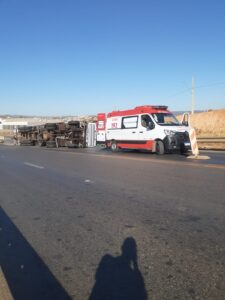 Carreta tomba e motorista de 71 anos fica ferido próximo a Juramento, em Montes Claros