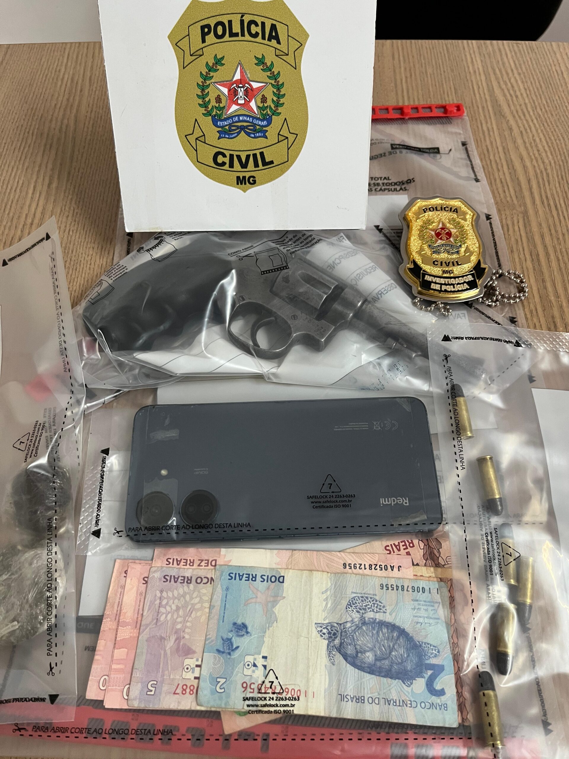 Durante o cumprimento de mandado de busca em um imóvel na Ilha do Caiçara, local conhecido pelo intenso comércio de drogas, foram encontrados um revólver calibre .32, porções de maconha, dinheiro, veículos, capacetes e uma bicicleta furtada. Um dos adolescentes portava a arma e tentou fugir, sendo contido após perseguição. O outro foi flagrado com entorpecentes e valores em espécie.