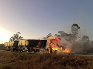 Carreta pega fogo na BR-251 em Santa Cruz de Salinas; motorista e irmão escapam sem ferimentos