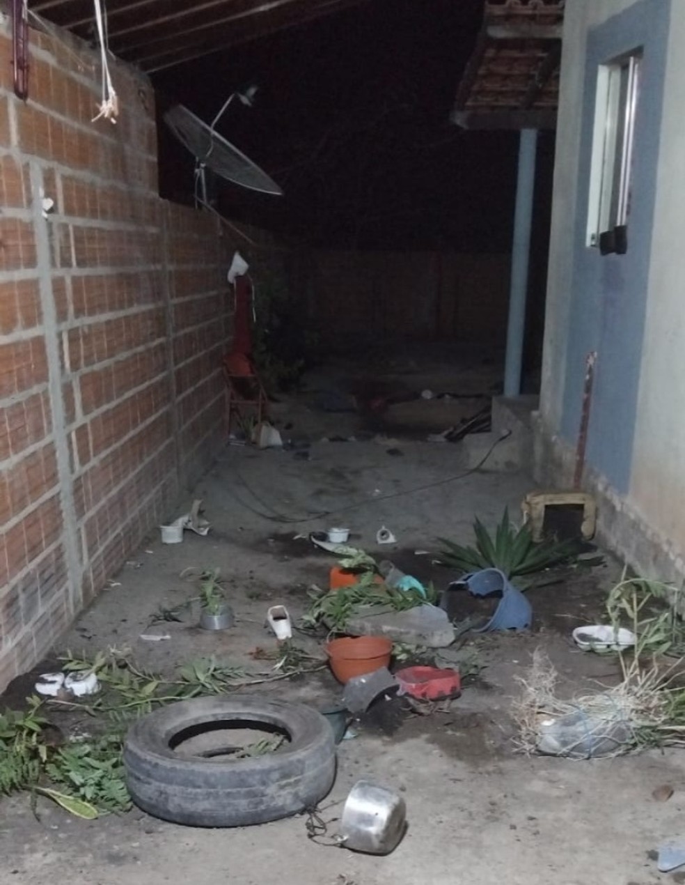 Ao chegarem à residência, os policiais se depararam com um cenário de destruição: utensílios domésticos quebrados, móveis revirados e vasos de plantas espalhados. No quintal, havia um amontoado de roupas e objetos pessoais da vítima em chamas. O fogo, que ameaçava se espalhar, foi controlado pelos militares.