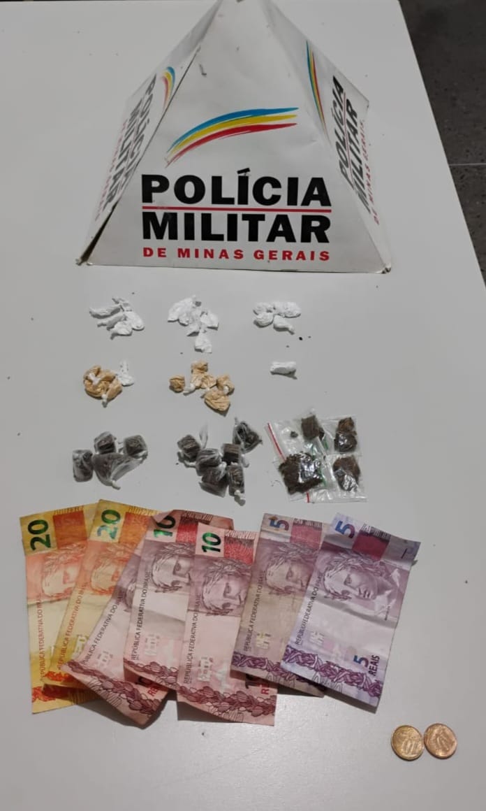 Os militares se deslocaram até o local indicado e localizaram o suspeito. Durante a abordagem, foram apreendidas 14 buchas de substância semelhante à maconha, 26 papelotes com características de cocaína e R$ 80 em dinheiro.