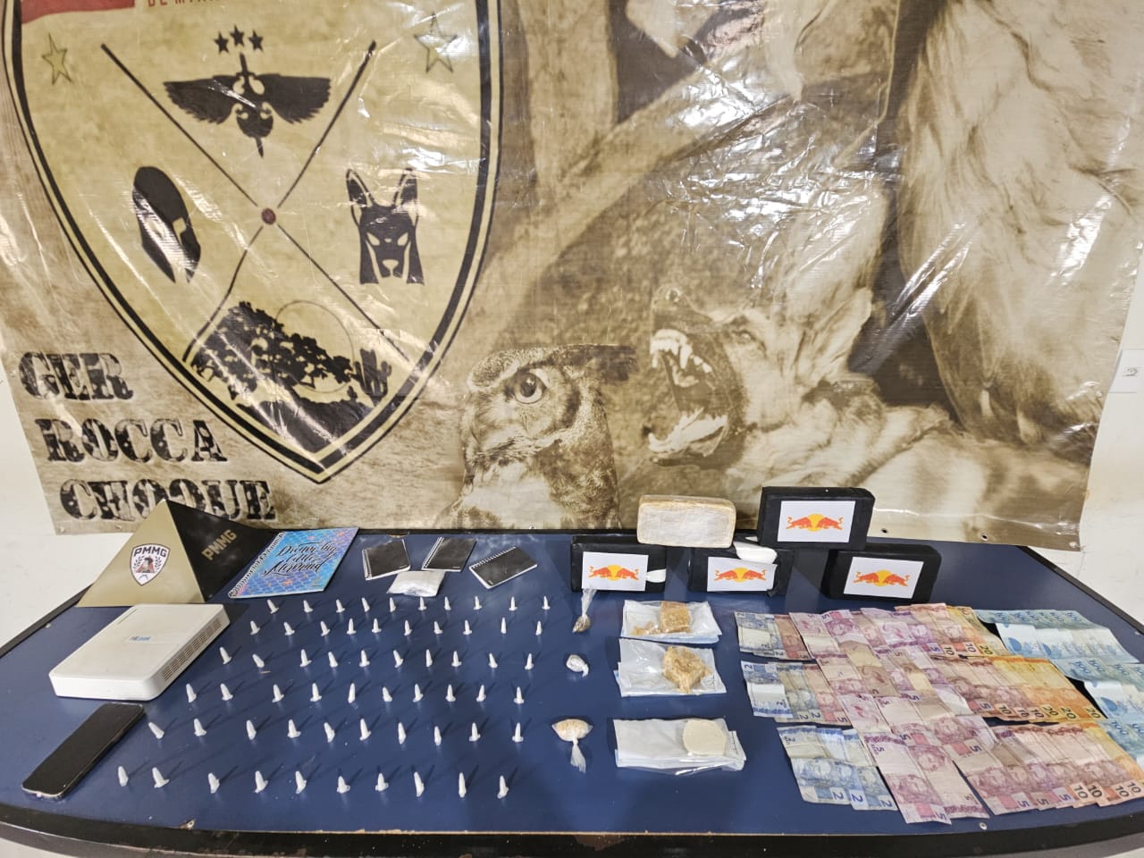 Com o apoio de cães farejadores, os militares realizaram buscas na casa e localizaram 60 pinos de cocaína, quatro pedras médias de crack, uma porção de pasta base de cocaína, duas buchas de maconha e R$ 1.866 em dinheiro.