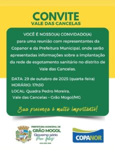 O distrito de Vale das Cancelas, em Grão Mogol, no Norte de Minas Gerais, receberá importantes informações sobre a implantação da rede de esgotamento sanitário local. A prefeitura, por meio da Secretaria de Obras, realizará uma reunião com representantes da Copanor no próximo dia 29 de outubro, às 17h30, na quadra Pedro Moreira.