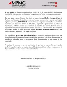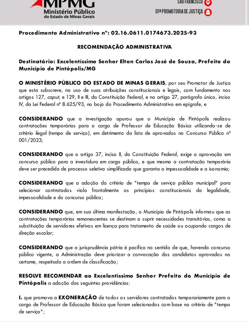 O Ministério Público de Minas Gerais (MPMG), por meio da 1ª Promotoria de Justiça de São Francisco, emitiu uma Recomendação Administrativa ao prefeito de Pintópolis, Elton Carlos José de Souza, solicitando a exoneração imediata de servidores contratados temporariamente para o cargo de Professor de Educação Básica, selecionados com base no tempo de serviço, critério considerado ilegal pela instituição.