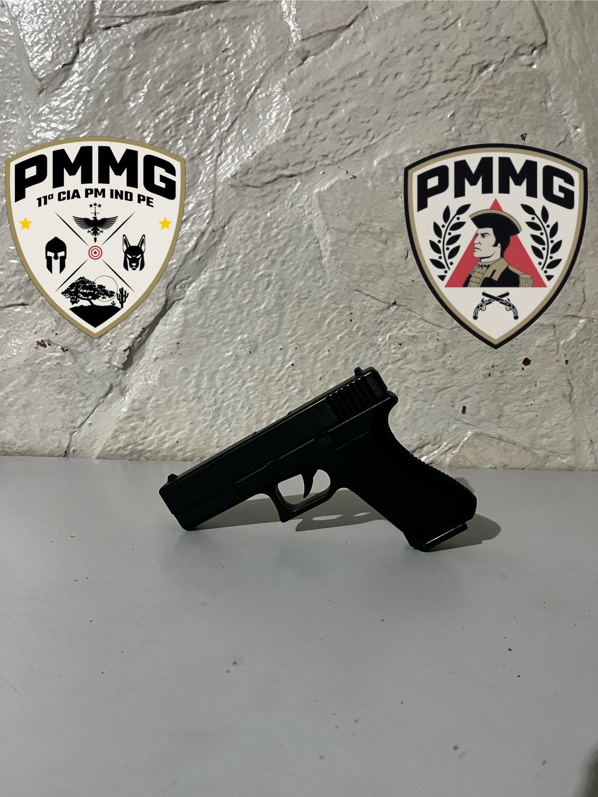 Durante buscas no imóvel, os militares encontraram um simulacro de pistola semiautomática preta, escondido entre duas paredes. O suspeito permaneceu em silêncio ao ser questionado sobre a arma.