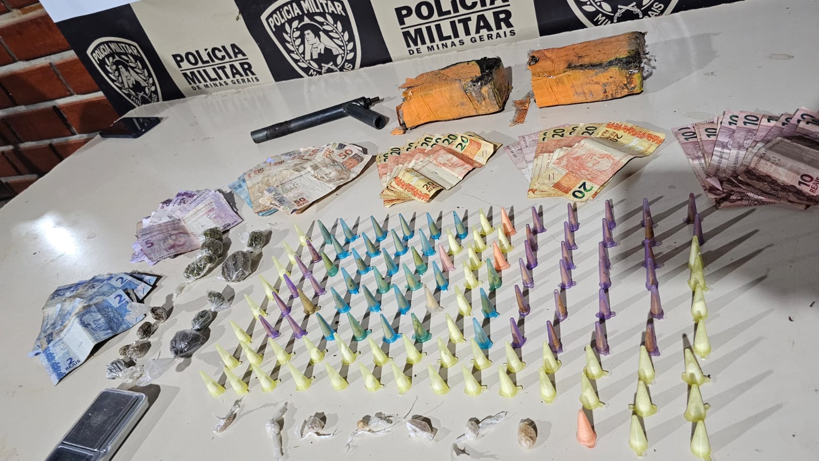 No local, foram localizados 95 pinos de cocaína, 12 buchas de maconha, uma arma de fogo artesanal, uma balança de precisão e R$ 1.599 em dinheiro. No quintal, os militares ainda encontraram duas barras de maconha enterradas.