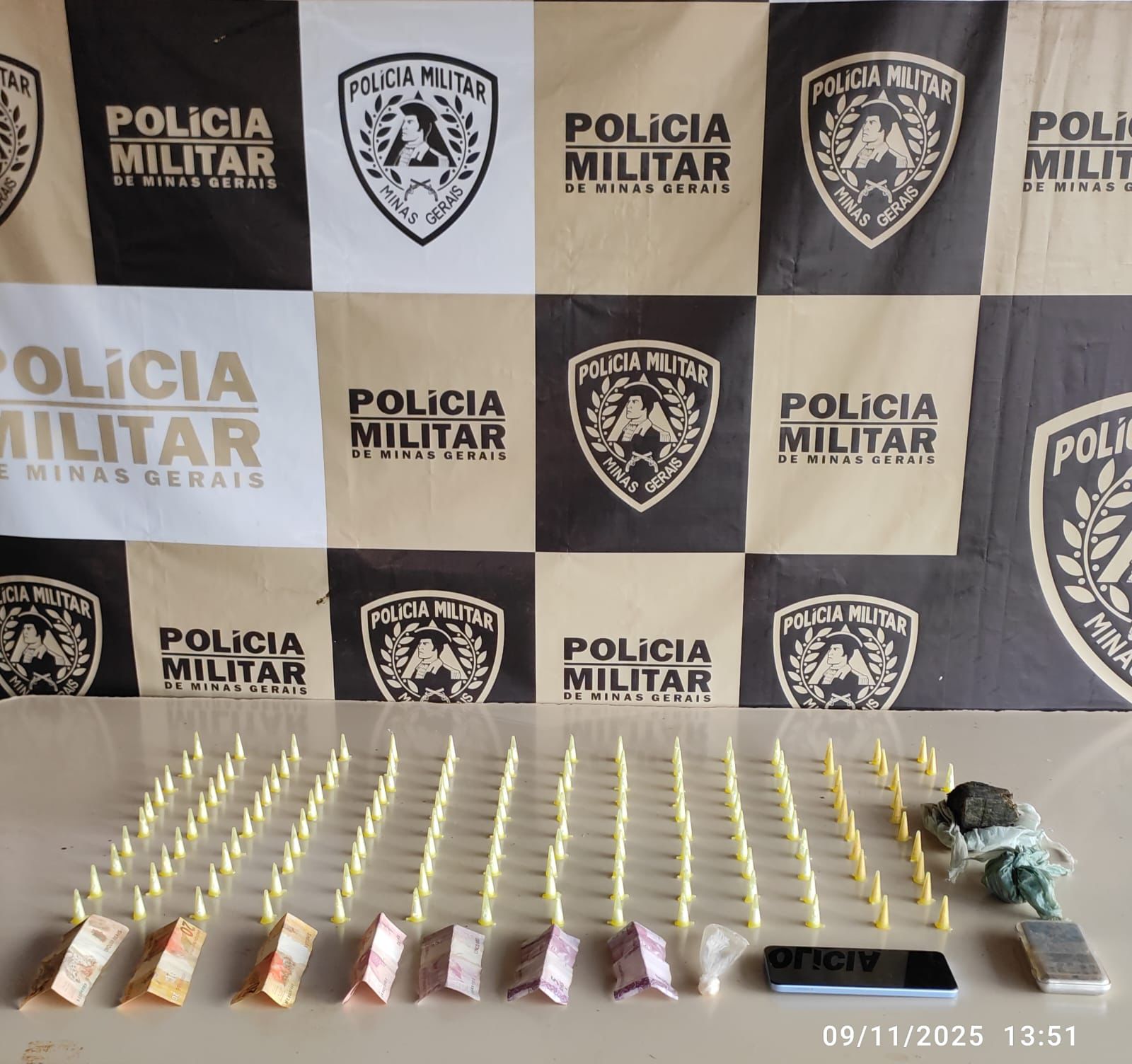Na abordagem, foram apreendidos 143 pinos de uma substância semelhante à cocaína, seis pedras de crack, um tablete e uma pequena porção de maconha, além de uma balança de precisão e R$ 115 em dinheiro.