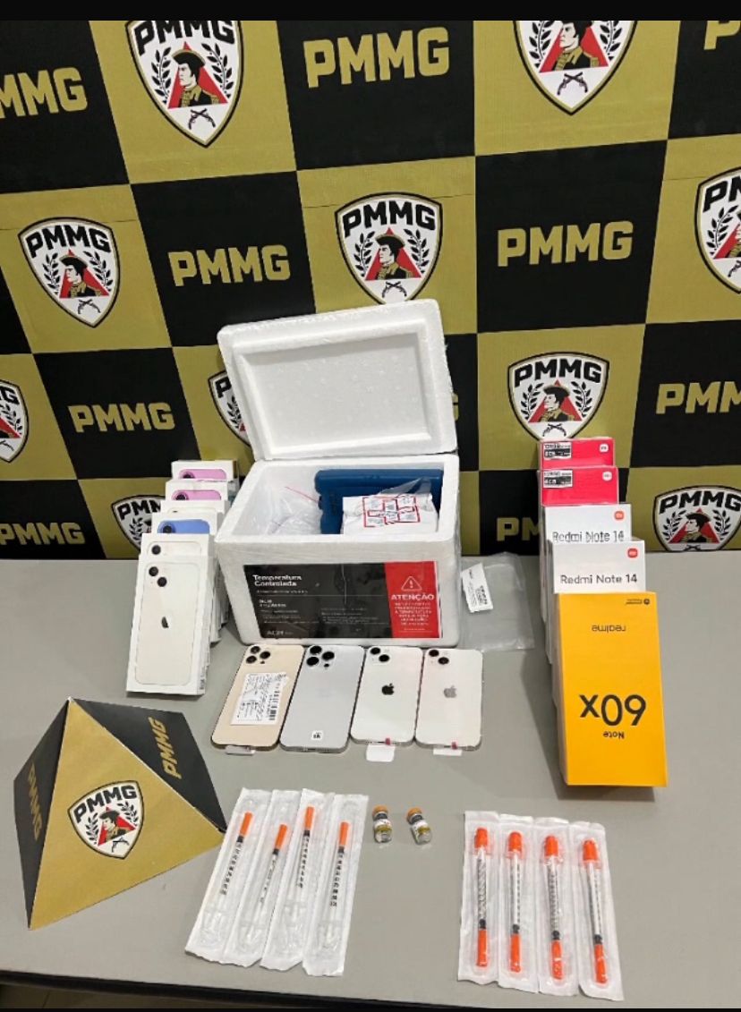 Com a autorização do responsável pelo transporte, as caixas foram abertas. Dentro delas, os policiais localizaram 15 aparelhos celulares e medicamentos sem autorização de comercialização no país, incluindo dois frascos de tirzepatida 15 mg/0,5 ml, além de oito seringas. O motorista do ônibus, de 46 anos, não apresentou notas fiscais ou qualquer comprovação legal da origem dos produtos.