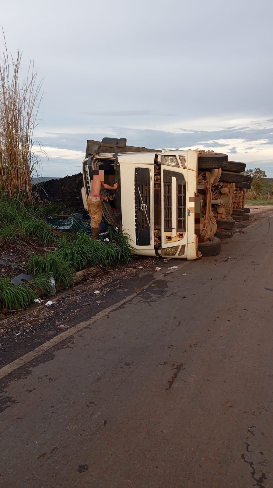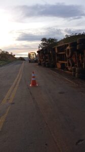 Caminhão carregado de carvão tomba na MG-451 e deixa dois homens feridos em Olhos D’água