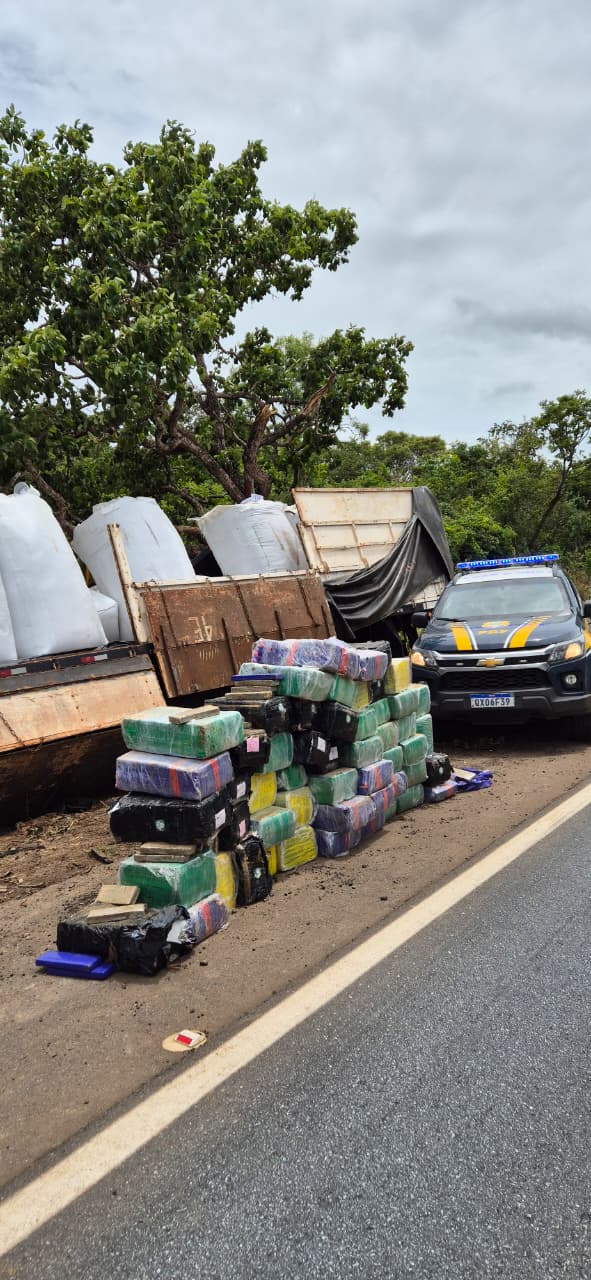 Segundo a PRF, a ocorrência foi registrada no km 302 da rodovia, onde os policiais se depararam com um cavalo mecânico e uma carreta acidentados às margens da pista. Durante a fiscalização dos veículos, a equipe encontrou diversos fardos de maconha escondidos na carreta.