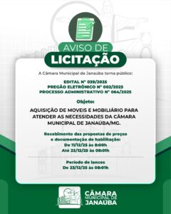 A Câmara Municipal de Janaúba tornou público o início de um novo processo licitatório destinado à aquisição de móveis e mobiliário, com o objetivo de atender às necessidades administrativas e operacionais da instituição.