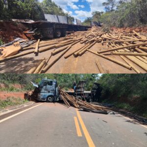 Mulher morre após caminhão carregado de eucalipto sair da pista na LMG-677, em Turmalina