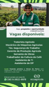 A Ecoagrícola divulgou nesta sexta-feira (16) a abertura de diversas vagas de emprego para atuação em fazenda localizada próxima ao município de Várzea da Palma, no Norte de Minas Gerais.