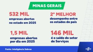 Minas Gerais registrou a abertura de mais de 532 mil empresas em 2025, o equivalente a 1,4 mil novos CNPJs por dia, segundo levantamento do Sebrae Minas com base em dados da Receita Federal. O desempenho coloca o estado na segunda posição nacional, atrás apenas de São Paulo, que contabilizou quase 1,5 milhão de novos negócios no período.