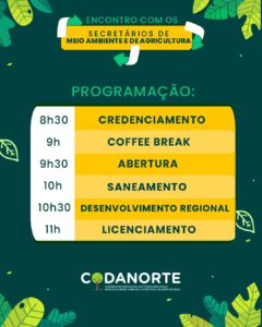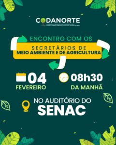 O encontro reunirá gestores públicos, técnicos e interessados nas áreas ambiental e agrícola, com foco especial nas ações conduzidas pelos Departamentos de Saneamento, Desenvolvimento Ambiental e de Licenciamento, Controle e Fiscalização Ambiental, além de Desenvolvimento Regional do Codanorte.