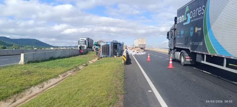 Segundo a Polícia Militar Rodoviária, o motorista perdeu o controle da direção ao tentar acessar o anel viário em direção à BR-251. O veículo acabou tombando no canteiro central, na saída Norte da BR-135, espalhando a carga pela pista.