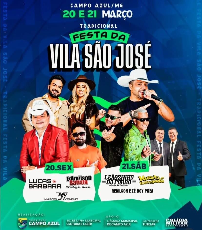Entre os dias 20 e 21 de março, o distrito de Vila São José, pertencente ao município de Campo Azul, realiza a 21ª edição da Festa da Vila São José. O evento faz parte do calendário cultural local e reúne moradores e visitantes em dois dias de programação musical e atividades voltadas à comunidade.