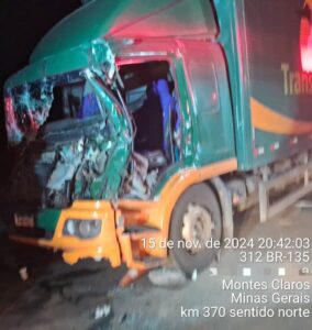 Motorista fica preso às ferragens em colisão entre carretas na BR-135 e é resgatado pelos bombeiros, em Montes Claros