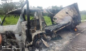 Caminhão carregado de painéis de iluminação fica destruído após pegar fogo na BR-365
